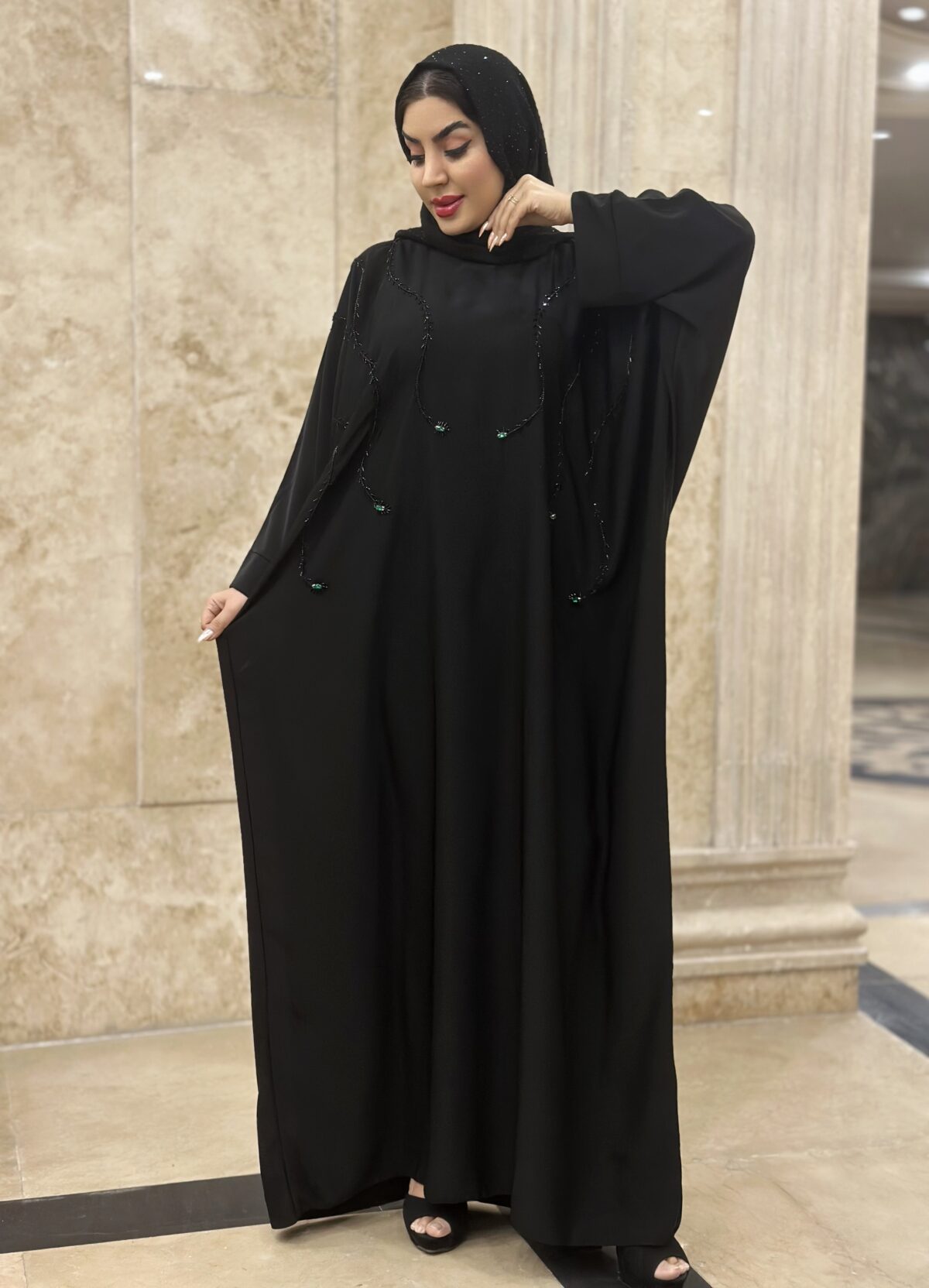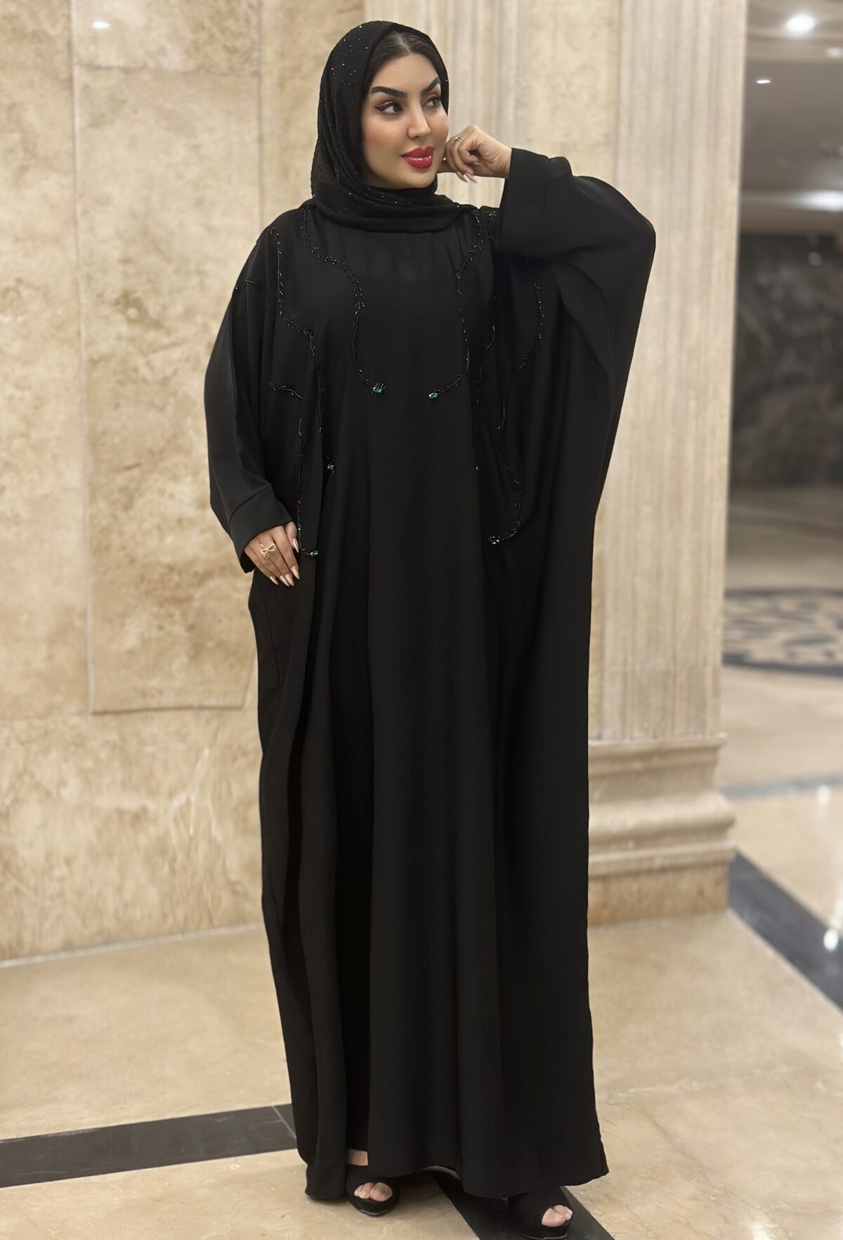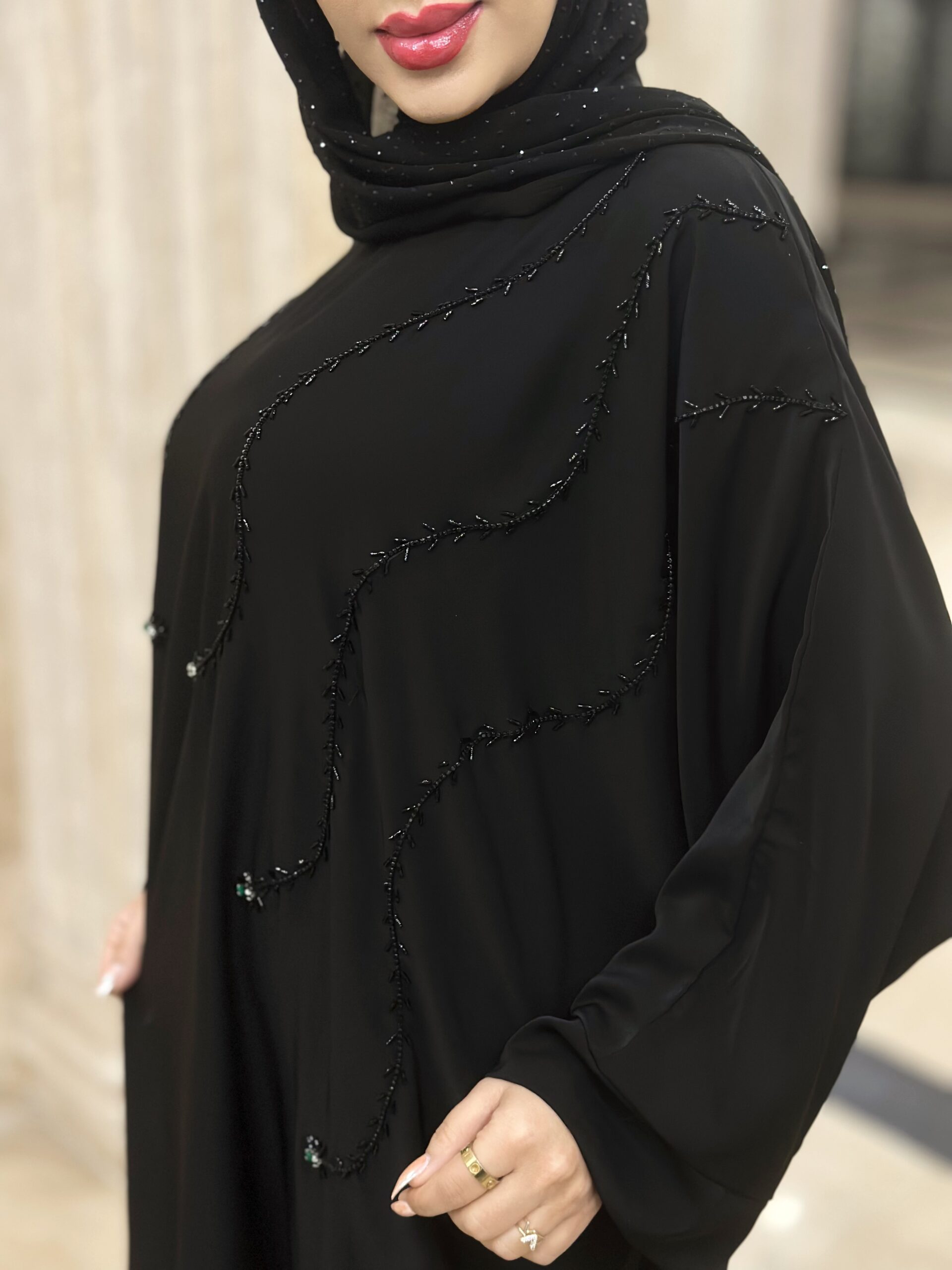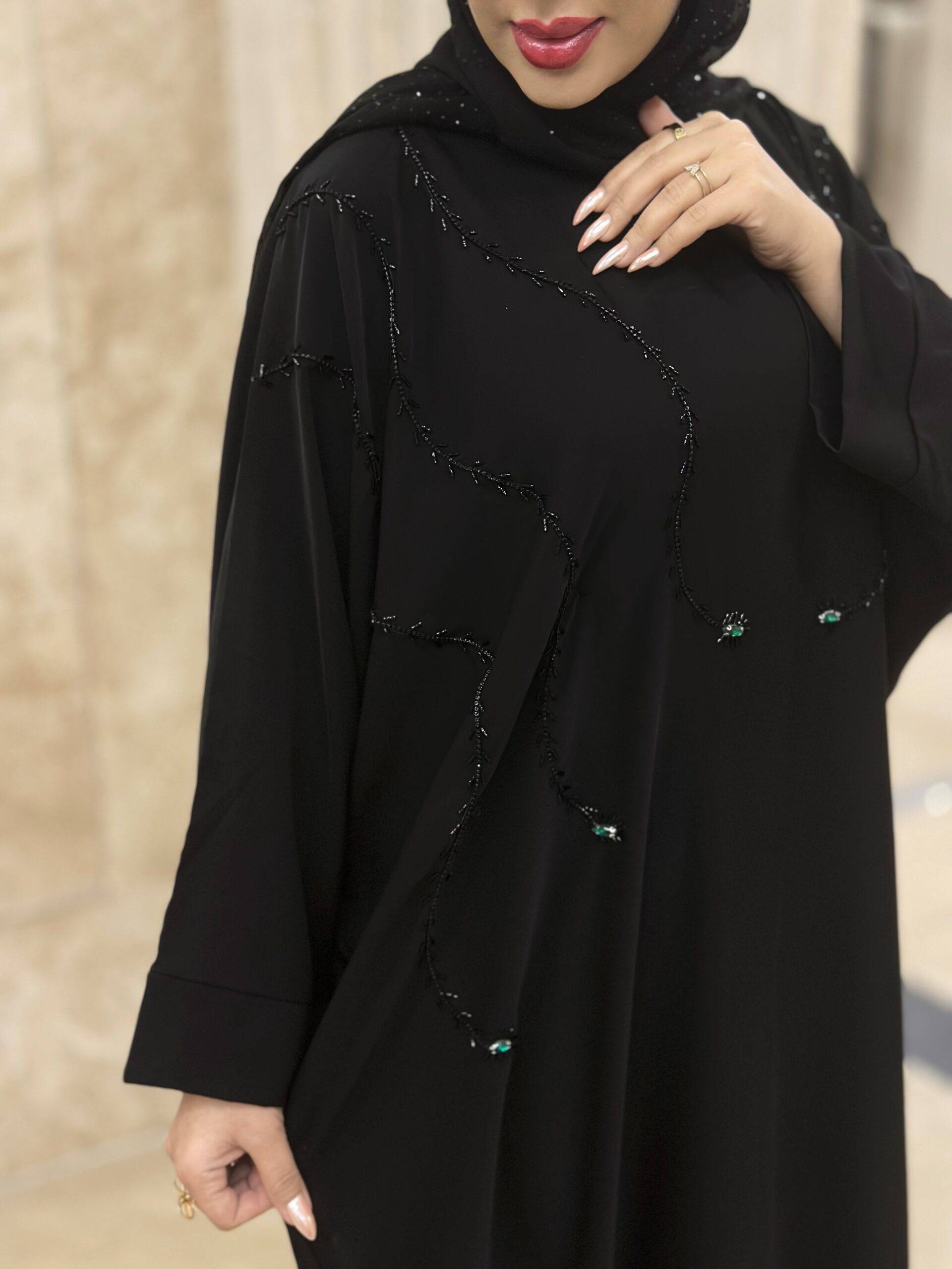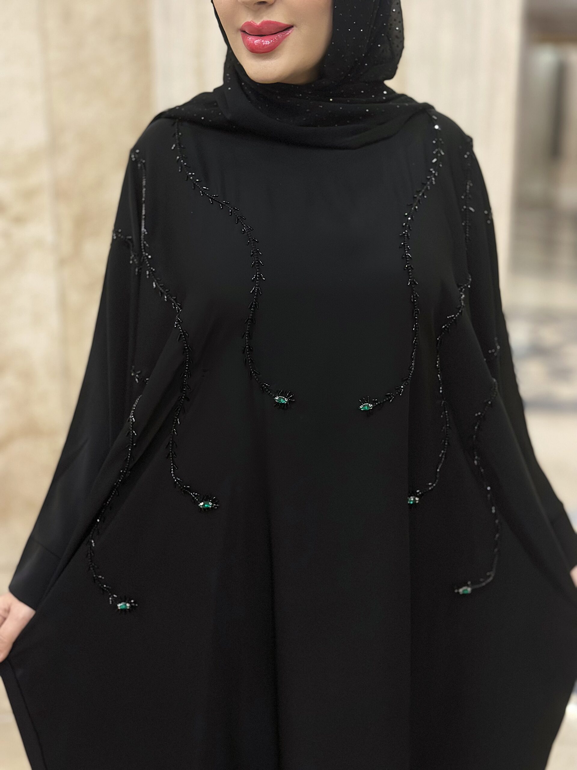 دسته عبا مجلسی مانتوعبایی مجلسی مدل شایسته پارچه کرپ الیزه گرم بالا دارای بند تنظیم از داخل خرجکار منجوق دوزی