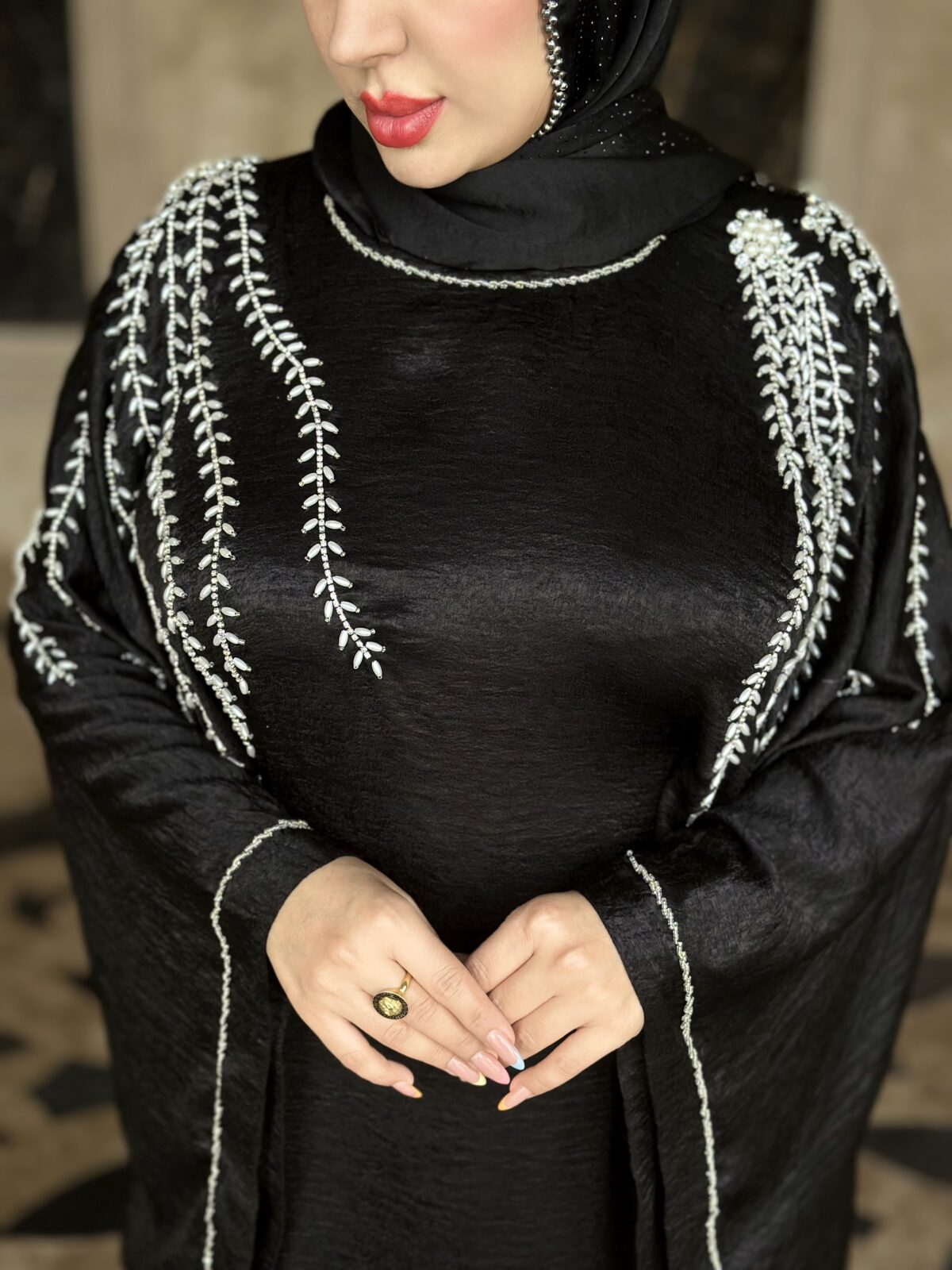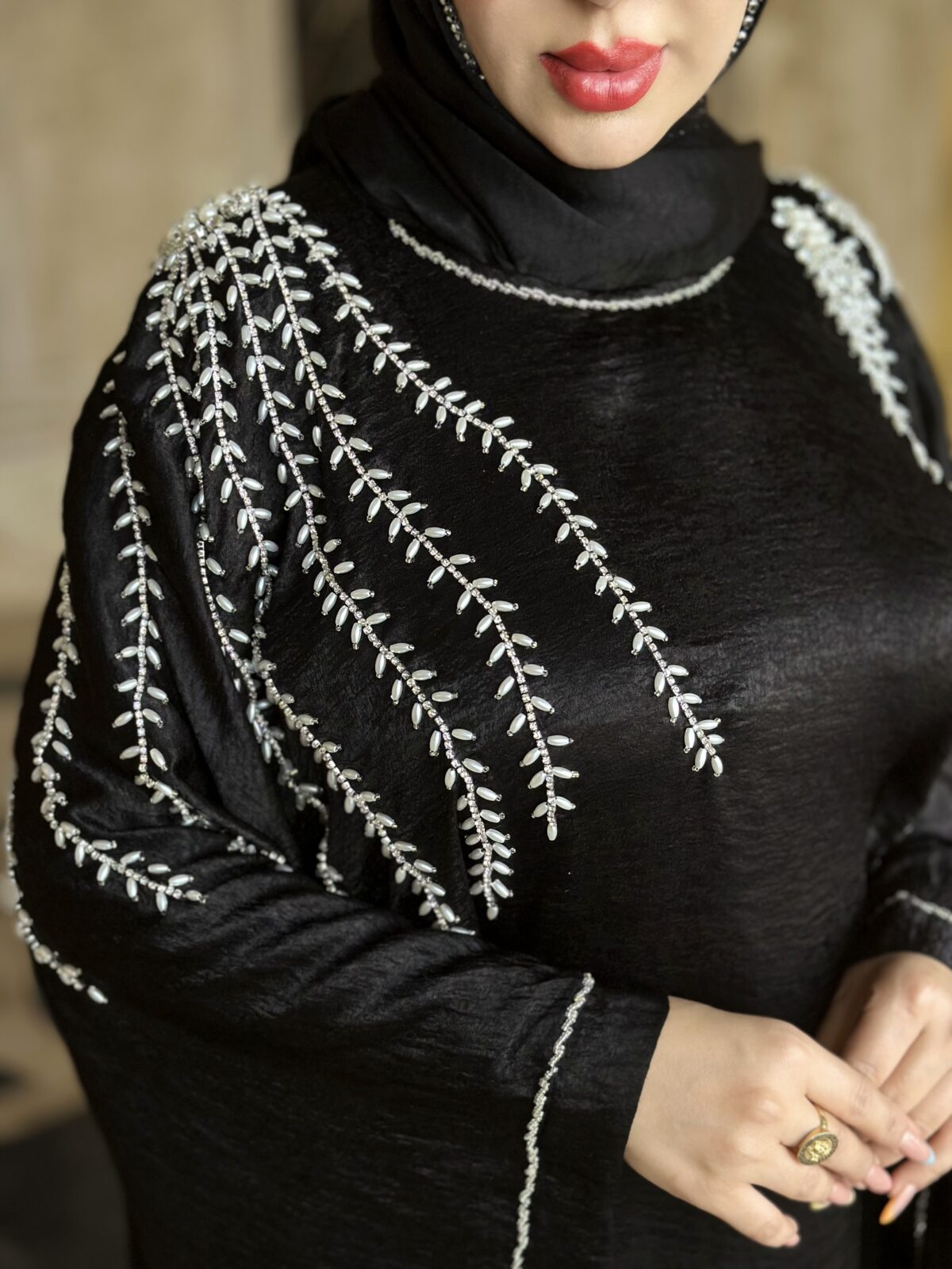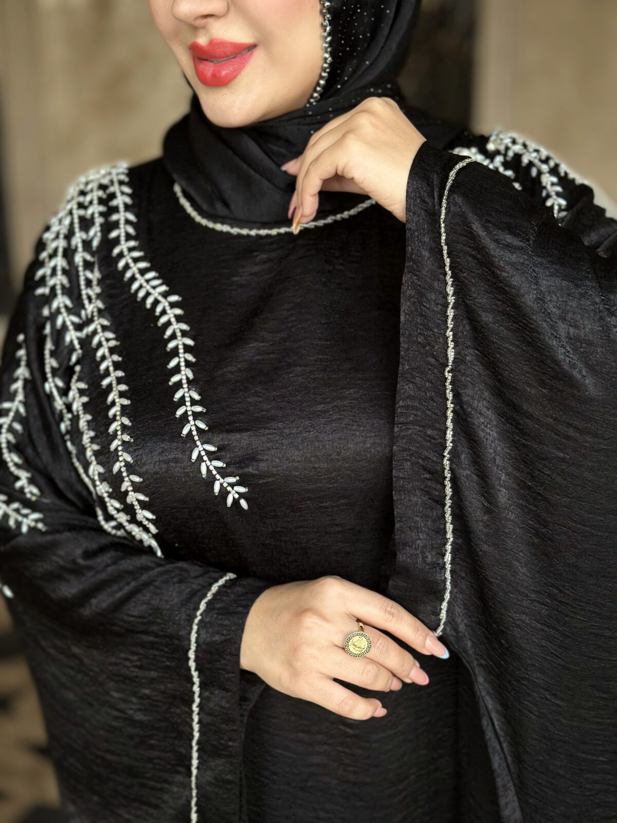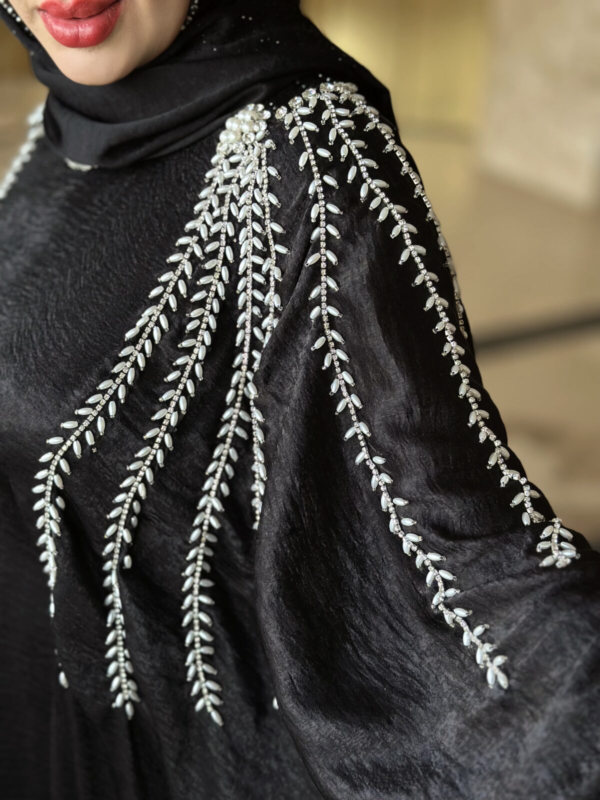دسته عبا مجلسی مانتوعبایی مجلسی مدل شایسته پارچه کرپ الیزه گرم بالا دارای بند تنظیم از داخل خرجکار منجوق دوزی