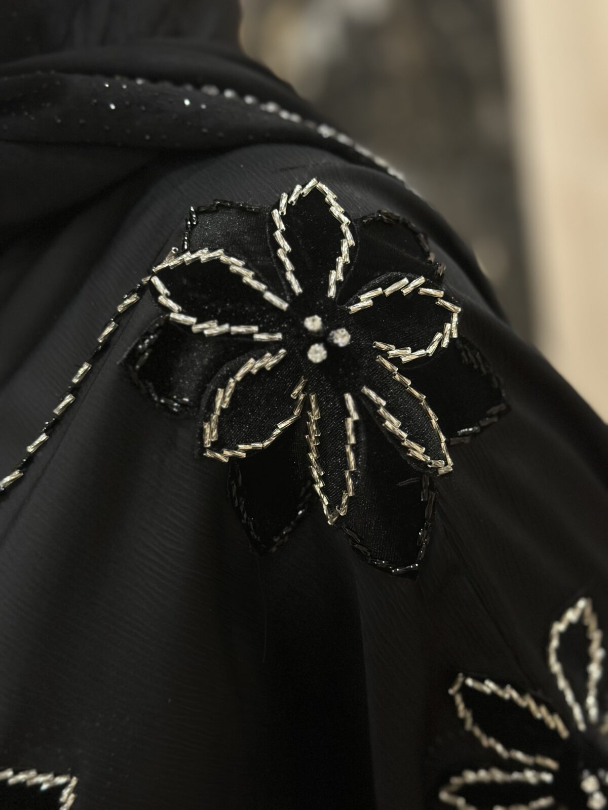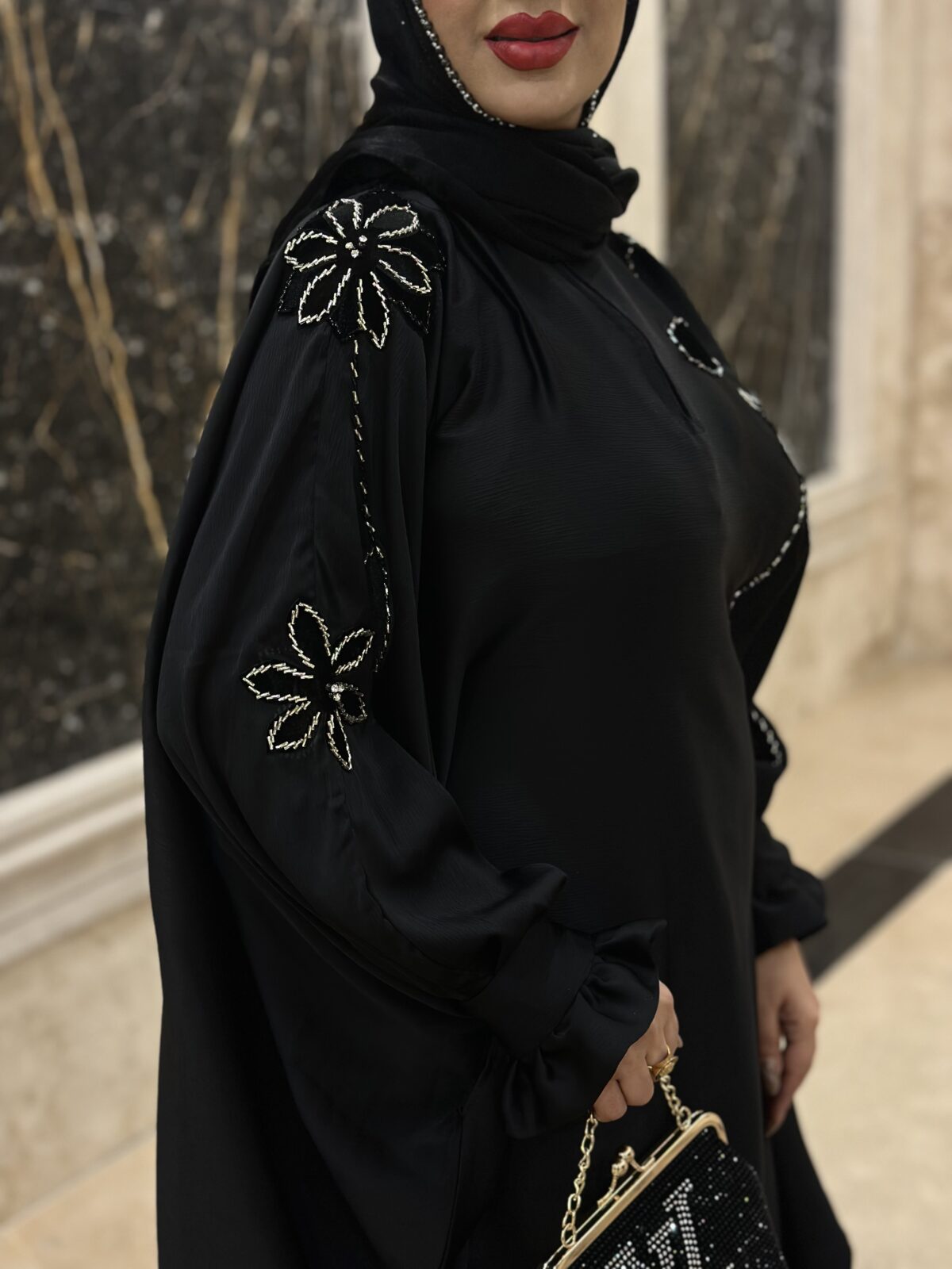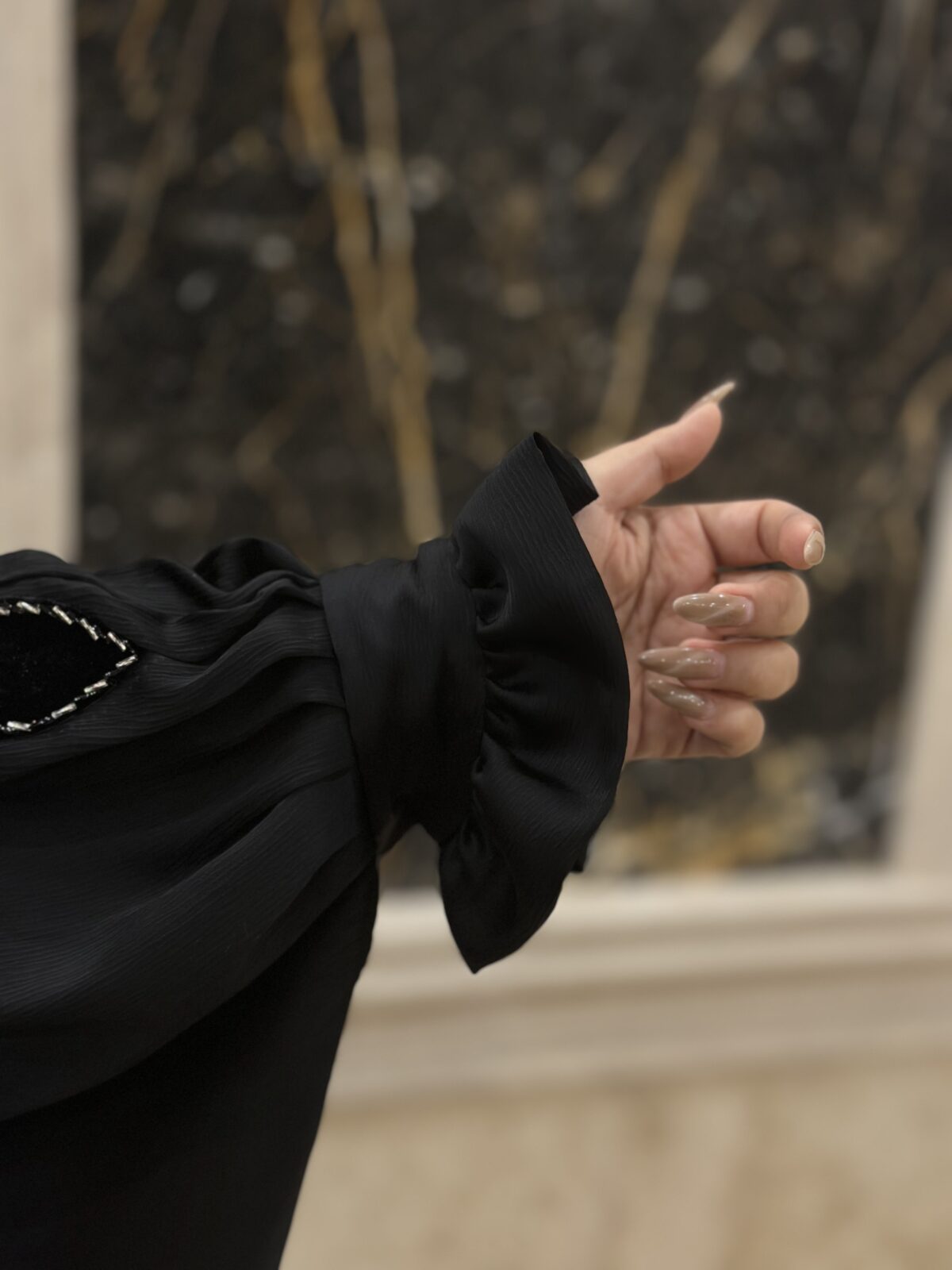 دسته عبا مجلسی مانتوعبایی مجلسی مدل شایسته پارچه کرپ الیزه گرم بالا دارای بند تنظیم از داخل خرجکار منجوق دوزی