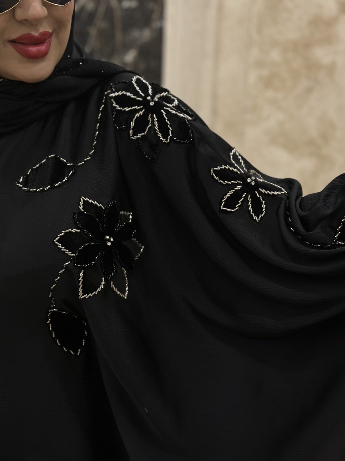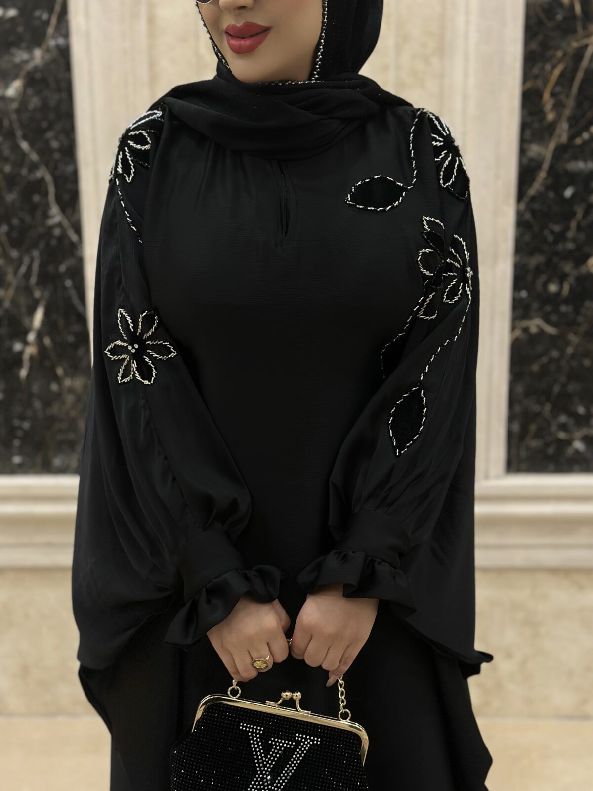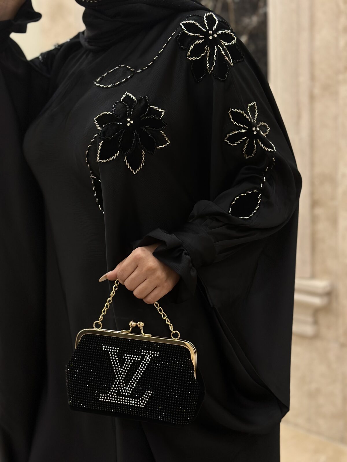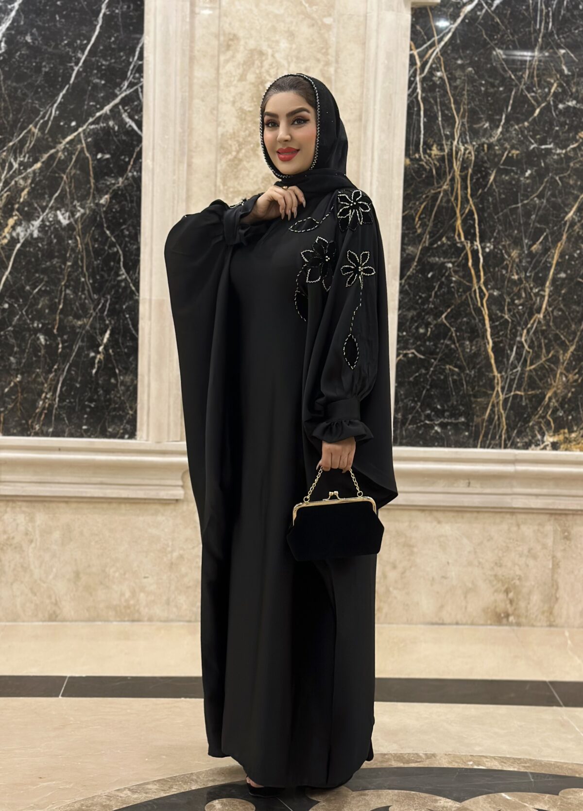 دسته عبا مجلسی مانتوعبایی مجلسی مدل شایسته پارچه کرپ الیزه گرم بالا دارای بند تنظیم از داخل خرجکار منجوق دوزی